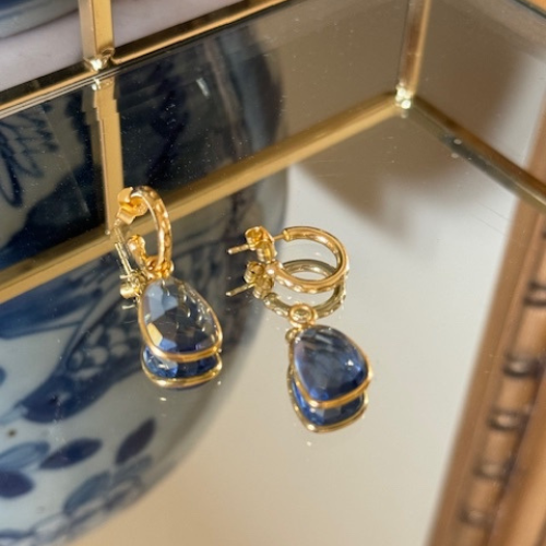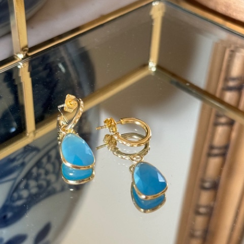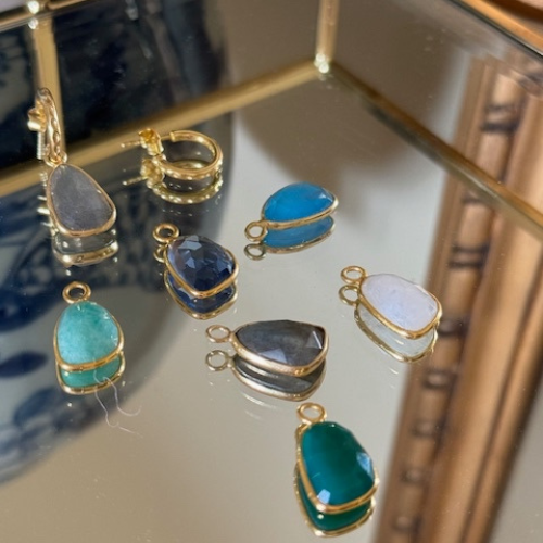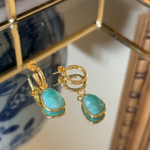 18ct gold plated on sterling silver. Amazonite, Blue Chalcedony, Green Onyx and Iolite Quartz Pendants on 1.5 cm Hoops. 1.2 cm wide/3 cm long.